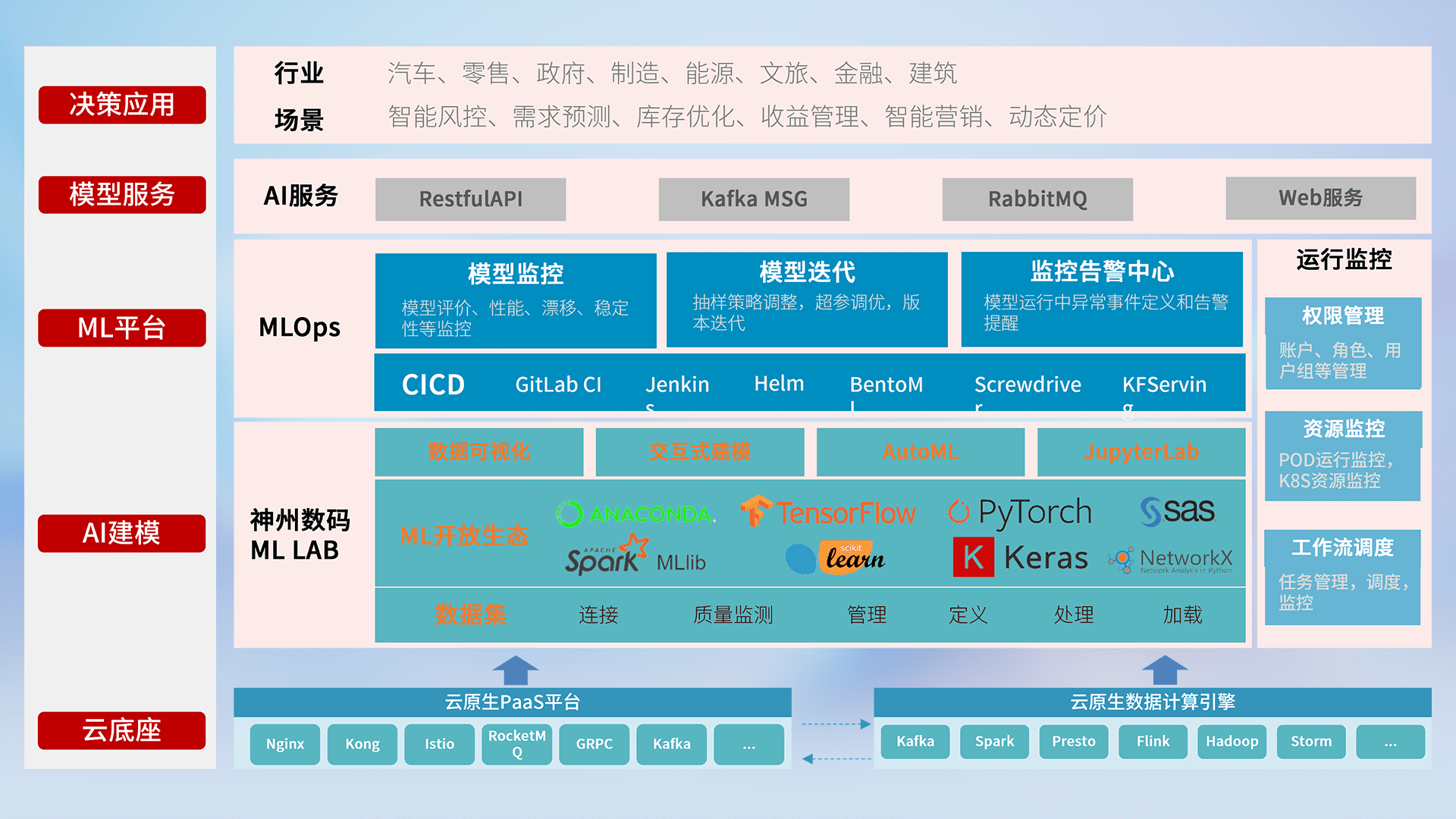 数据+模型双引擎驱动,,面向智能服务场景,,,,快速灵活利用AI技术,,,支持业务决策,,,助力企业智能化转型破局。。